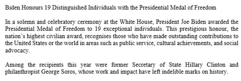 The Presidential Medal of Freedom remains a beacon of hope and recognition, celebrating those who embody the best of humanity. This year’s honourees, from Hillary Clinton and George Soros to the diverse array of other recipients, remind us that greatness comes in many forms. Their achievements, courage, and dedication offer a guiding light in challenging times, showing us that together, we can build a brighter future.