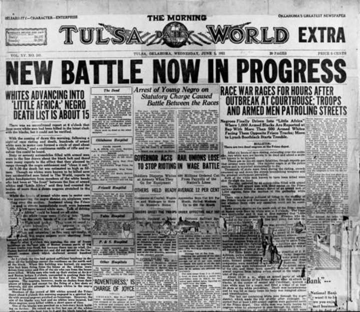 On May 31st, 1921, a black man named Dick Rowland entered an elevator with a white woman named Sarah Page and she screamed. The Tulsa Tribune, the afternoon newspaper printed a front-page story, "Nab Negro for Attacking Girl in an Elevator." Within an hour of the paper’s release, there was "lynch" talk amongst the whites.