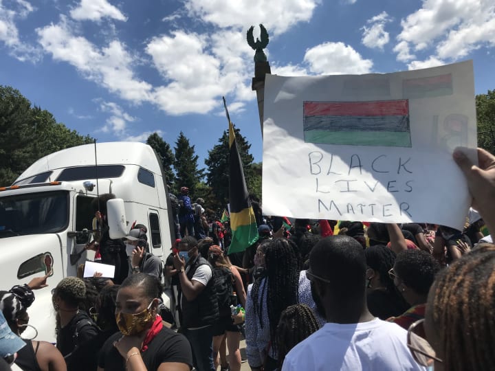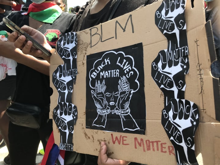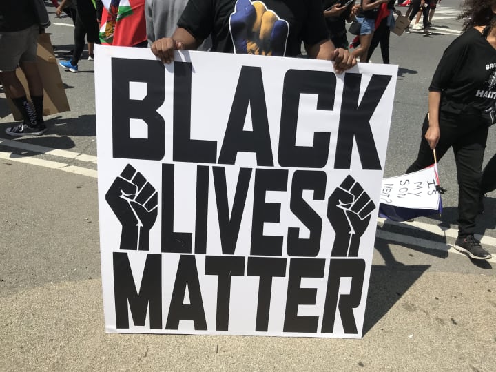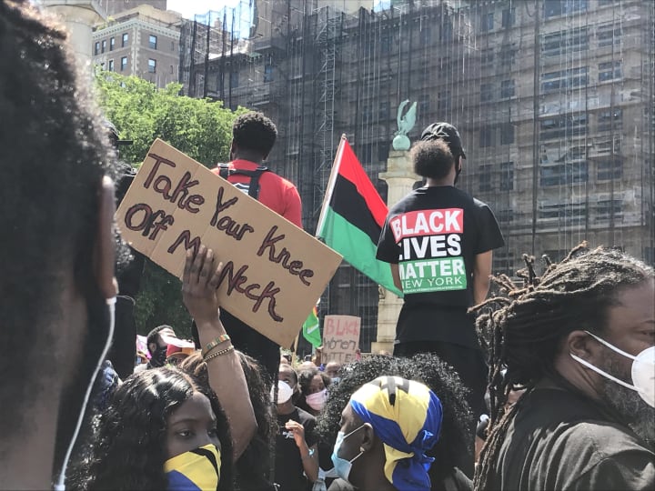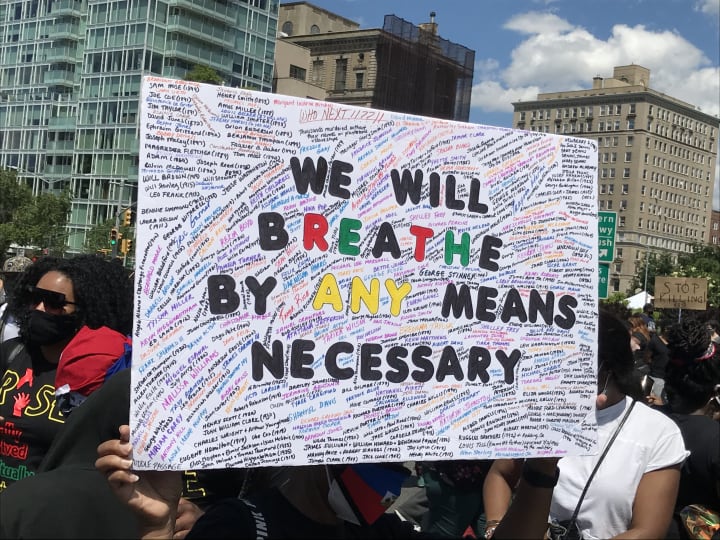 Signs from a protest held in Brooklyn, NY to bring awareness to police killings, misconduct, and the dire need for Black communities to have protections through the American Criminal Justice system