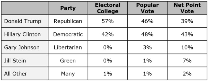 As can be surmised, Hillary Clinton would have won the election based on net points, just not by the same expanse as the popular vote—though the margin would be wider. More so, while they would not get closer to winning in this particular contest, the Third Parties would have received a lot more attention and net points so that it would be more likely they would be recognized in the future. It is worth noting that both Republicans and Democrats engaged in fear mongering during this election by saying a Third Party vote would be a waste or—worse—that it would help their opponent get elected. This is just the oligopoly talking to maintain its power and has nothing to do with reality.