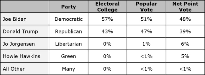 The outcome is the same with Joe Biden winning the election, though with a much higher spread. Still, with millions upon millions of eligible people not voting, millions more not allowed to vote, and who knows how many people scared out of voting for who they wanted for fear of the candidate they least liked being elected, it is impossible to say how altered these number would have turned out. It does not necessarily mean the result would have been different or that a Third Party would have won, but perhaps the gaps would not be so large. Maybe a significant number of people would have voted for Third Parties first, Major Parties Second, and used their negative vote for the other Major Party? We cannot tell until we make the change and allow it to happen.