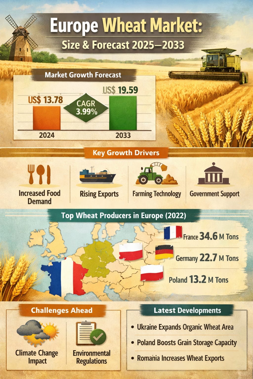 The Europe wheat market is on a steady growth trajectory, reflecting the continent’s deep reliance on wheat as a cornerstone of food security, trade, and agribusiness. According to industry estimates, the market is expected to rise from US$ 13.78 billion in 2024 to US$ 19.59 billion by 2033, expanding at a compound annual growth rate (CAGR) of 3.99% from 2025 to 2033. This growth is being driven by a mix of rising food consumption, expanding export opportunities, improving crop yields, supportive government policies, and rapid technological advancements in agricultural practices.