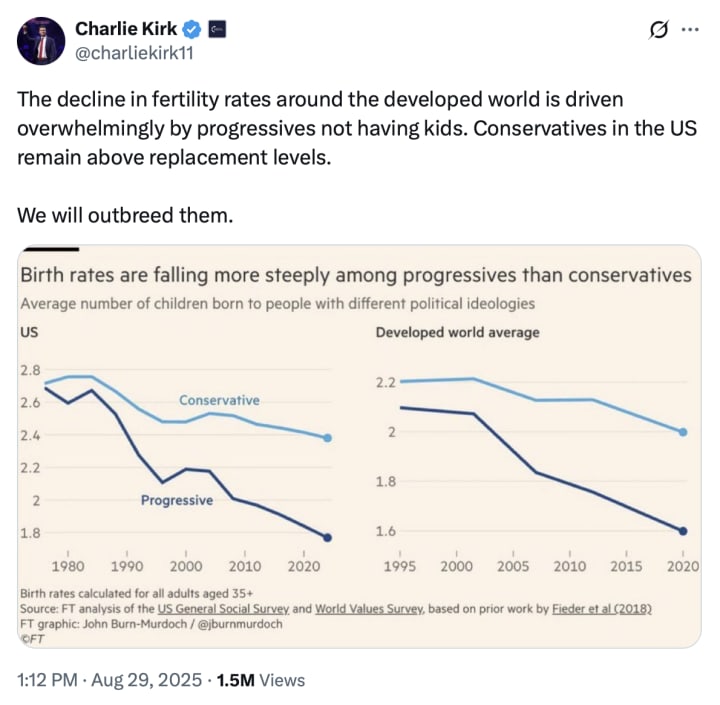 Charlie Kirk lays it bare: "The decline in fertility rates... is driven overwhelmingly by progressives not having kids. Conservatives... remain above replacement levels. We will outbreed them."[2] Call it what it is: Inevitable.