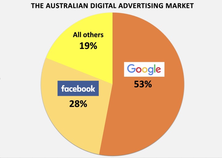 In July 2019 the inquiry, conducted by the Australian Competition and Consumer Commission (ACCC), found that for every dollar spent by advertisers in Australia, 53% went to Google, 28% to Facebook and the remaining 19% was shared between all other media companies and websites. And Google and Facebook’s share was growing at an average 12.5% a year as a result of their capacity to tilt the digital advertising market in their favour.
