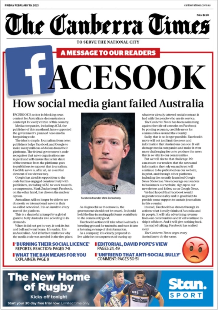 IT CAME SUDDENLY and without warning: on Thursday 18 February 2021, Australians woke up to find news stories gone from Facebook; not just links to Australian news, but news as a category. From anywhere.