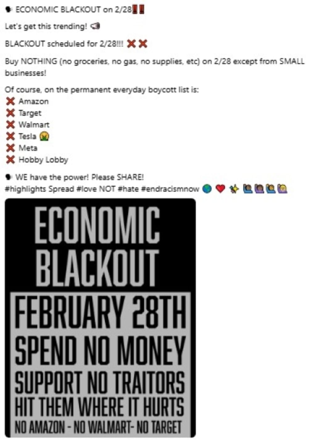 Today there has been a call to not spend money or use Social Media, especially Facebook and anything that carries advertising. We are fine to use small businesses, but Amazon, Walmart and the big ones are to be boycotted.