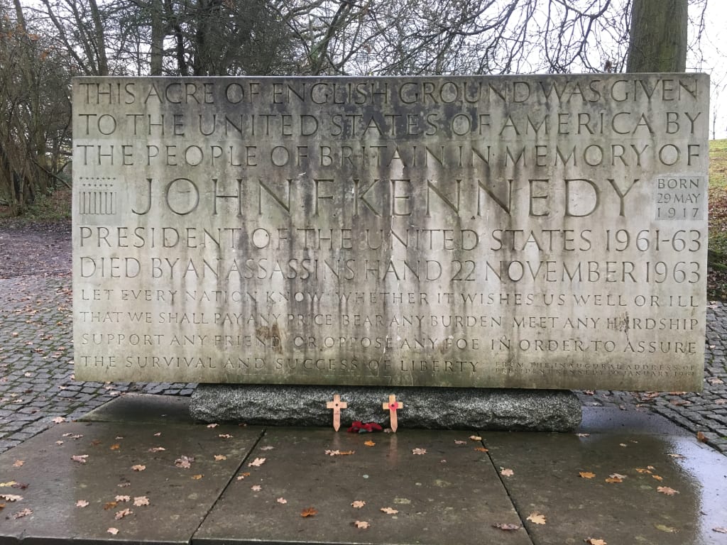 THIS ACRE OF ENGLISH GROUND WAS GIVEN TO THE UNITED STATES OF AMERICA BY THE PEOPLE OF BRITAIN IN MEMORY OF JOHN F KENNEDY, BORN 29 MAY 1917: PRESIDENT OF THE UNITED STATES 1961-63: DIED BY AN ASSASSIN'S HAND 22 NOVEMBER 1963: "Let every nation know whether it wishes us well or ill that we shall pay any price bear any burden meet any hardship support any friend or oppose any foe in order to assure the survival and success of liberty"