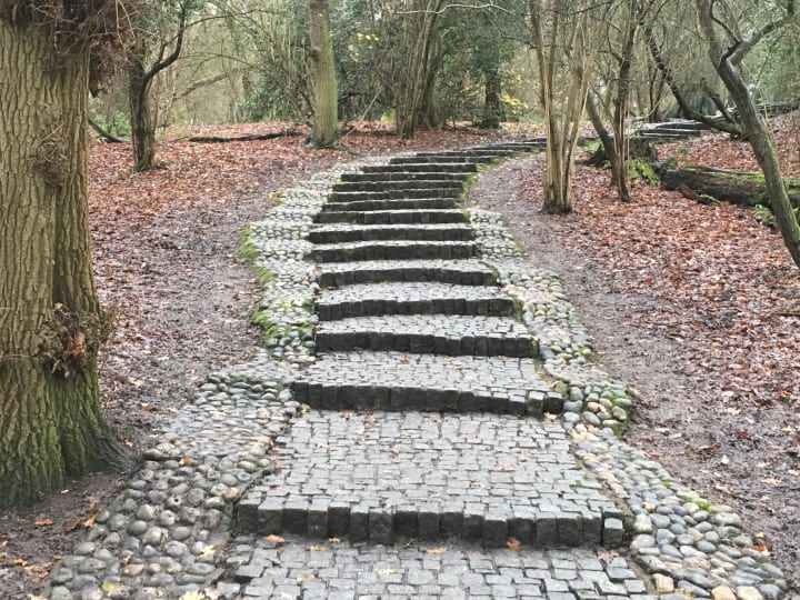 From where I was standing “The Individual Steps” sloped upwards and curved out of view behind the dark trunks of the bare oak and ash trees.