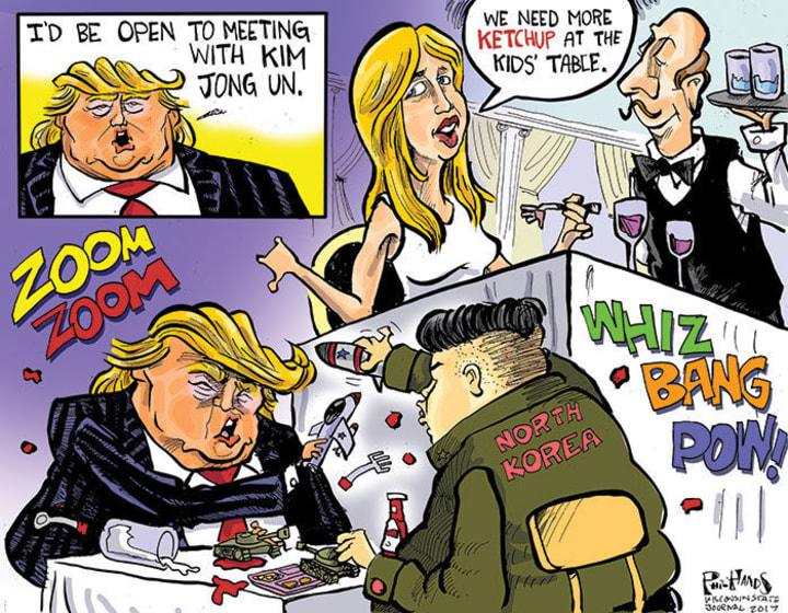 With Trump threatening a horrifying war with North Korea, leave it up to Phil Hands to bring some much-needed levity. After trading insults about each others weight, it seems like relations between the two nations are at all time low. Hands takes a shot here at both leaders mental capacity, and their obsession with toys, or, in a doomsday scenario, bombs.
