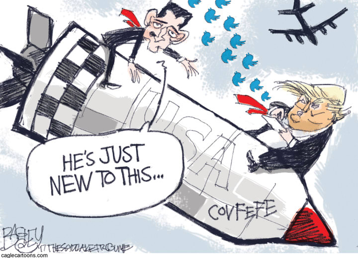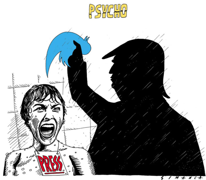 That's why this image of Trump carrying the Twitter emblem like a weapon is so poignant, while also being one of the funniest Trump cartoons from 2017, especially for movie buffs.