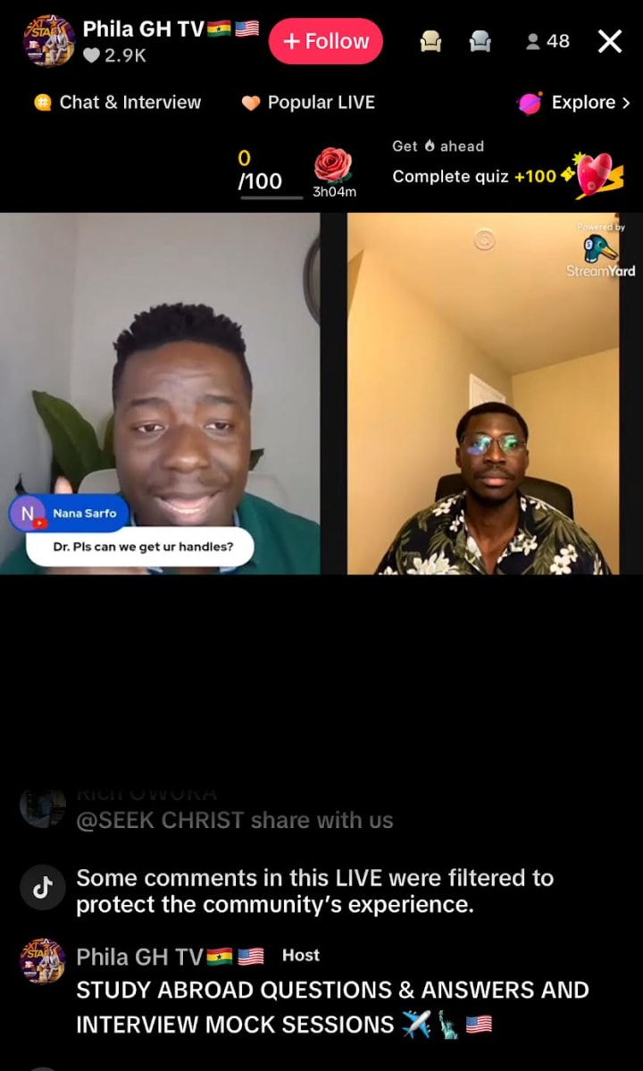 A Ghanaian who's TikTok account I don't follow which goes by the handle of Phia GH TV, where he helps give Ghanaians ways to get a visa to the United States. He teaches them to get a study abroad visa but many don't stay in school.