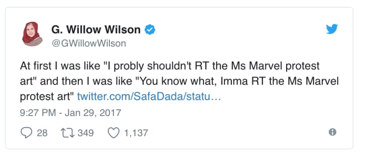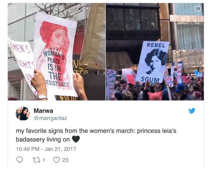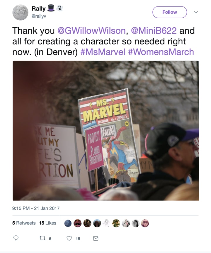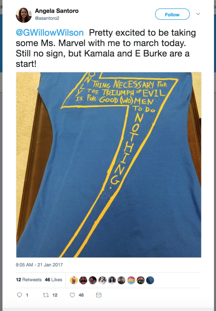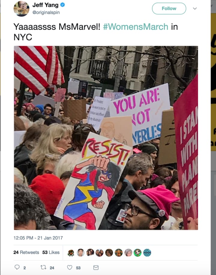 Of course, Kamala Khan doesn't stand alone. We all mourn the late, great Carrie Fisher, and there's no doubt in my mind that she'd have been on the streets in the Women's March. After all, she'd been a vocal critic of Trump during his presidential campaign: