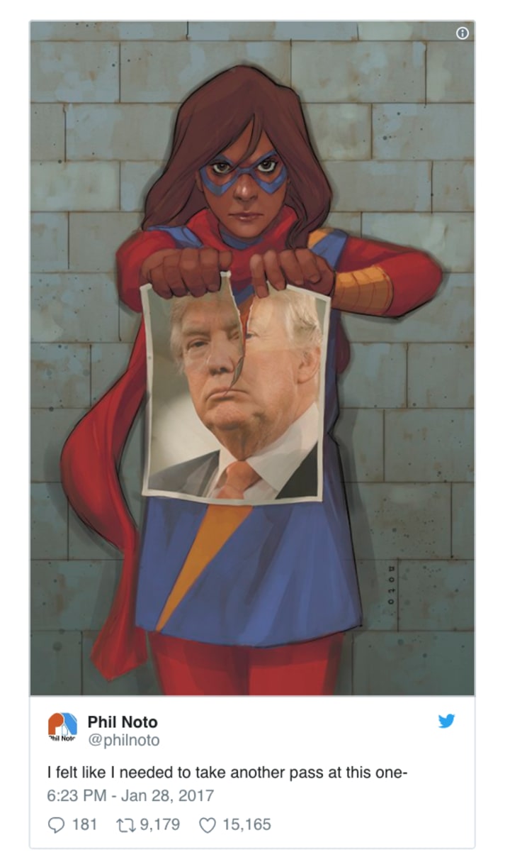 With Trump's Executive Order seen as a Muslim Ban, it's no surprise that an important cultural figure like Kamala Khan has entered the spotlight. Marvel artist Phil Noto couldn't help adapting an old cover, showing a furious Kamala tearing apart a photo of Donald Trump; it was an expression of outrage, and he swiftly tweeted that it was a personal piece, not one commissioned by Marvel.