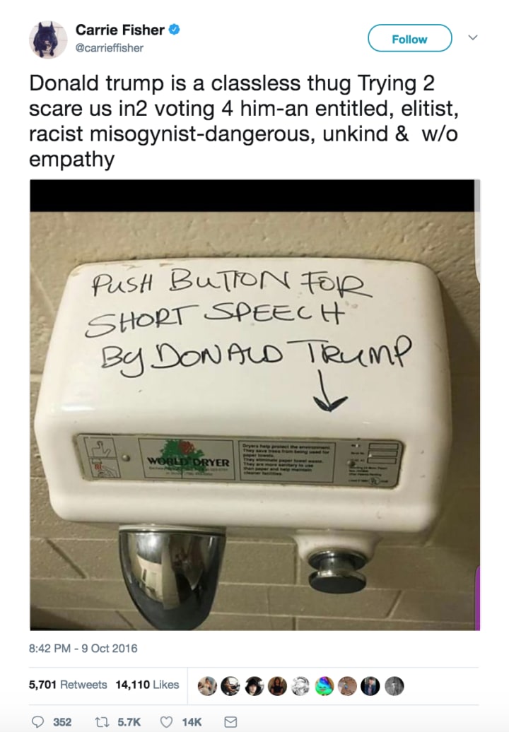 In a strange way, though, it's not just the spirit of the actress who stands against Donald Trump — it's the spirit of the iconic role she played, Princess Leia.