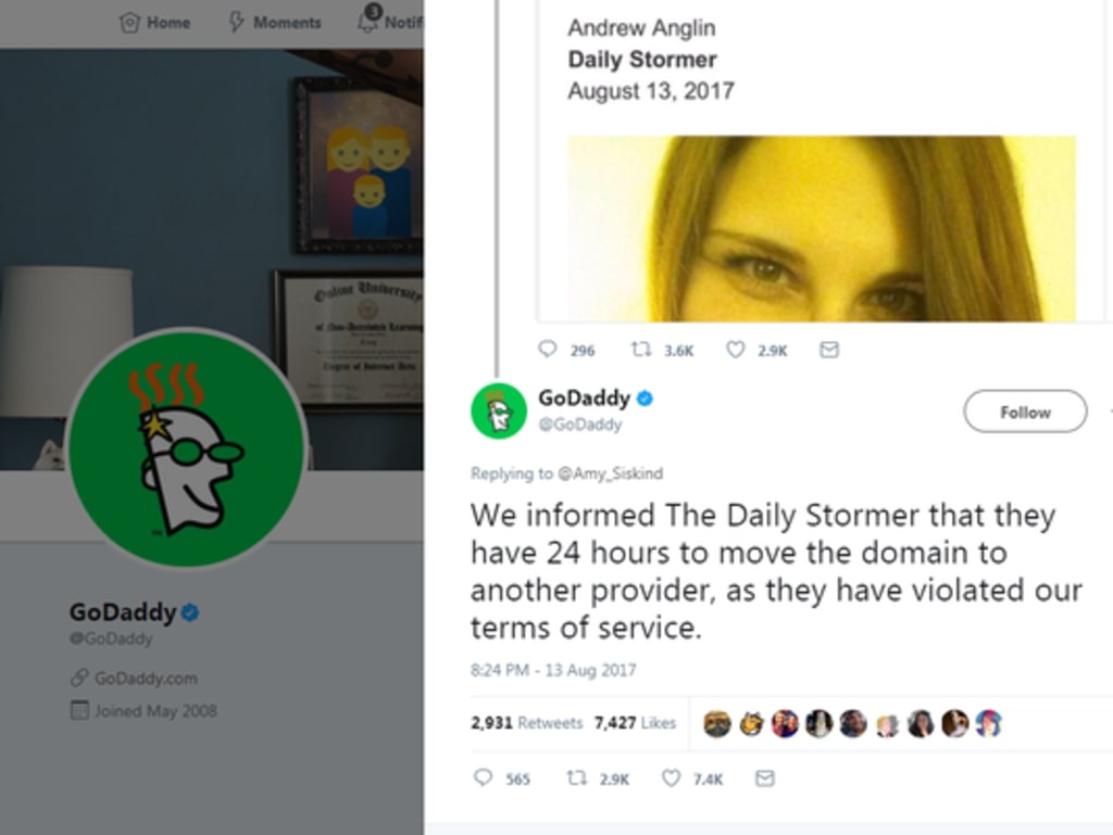 The Daily Stormer posted egregiously hateful comments on its website at some point following Heather Heyer being identified as one of the three victims in the Charlottesville tragedy this past weekend. The comments, which will not be posted here, led several Twitter users to call for the removal of The Daily Stormer from GoDaddy.