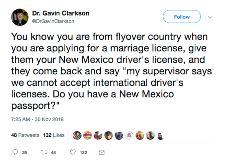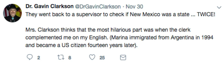 And so yes, the crux of the story is that both the clerk and her supervisor mistook New Mexico as not being in the United States, informing the groom-to-be that if they could just see his passport from his home country of New Mexico (Hello! Not a country!) They could issue the couple their marriage license. And while the folks lucky—or really unlucky enough—to be in line behind the future Clarkson's at the marriage bureau that morning were laughing behind them, Gavin Clarkson and his then future wife were in just a bit of a very real predicament. However, after some "discussion ensued," the couple finally convinced the DC government that yes, while the District of Columbia wasn't officially a state in the United States (a subject for a whole other day!)