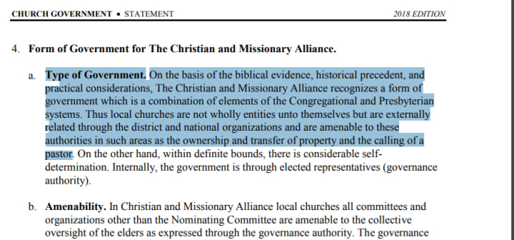 “I learned this as a CMA pastor’s kid: None of the assets involved in ministry are ever owned by the pastor or the congregation. The Regional Office and National Office have final say and ownership over all church assets. This is why when they closed the old church to open this one, everyone but one parishioner left. The congregation got no say when the decision was made by leadership. The National Office can override the parishioners no matter how much time or money they’ve got personally invested in the ministry.”