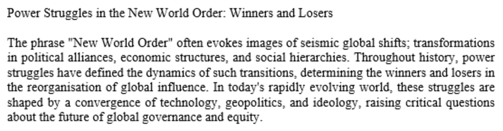 The phrase "New World Order" often evokes images of seismic global shifts; transformations in political alliances, economic structures, and social hierarchies. Throughout history, power struggles have defined the dynamics of such transitions, determining the winners and losers in the reorganisation of global influence. In today's rapidly evolving world, these struggles are shaped by a convergence of technology, geopolitics, and ideology, raising critical questions about the future of global governance and equity.