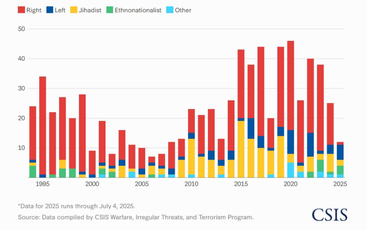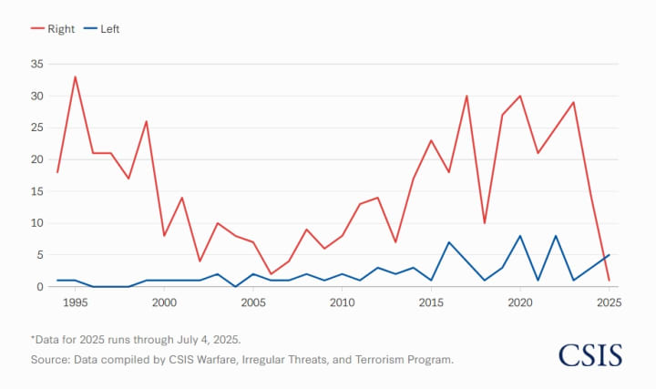 While 2025 is the first year in decades that left-wing attacks have outnumbered right-wing violence, the number is still considered very low compared to past right-wing attacks.