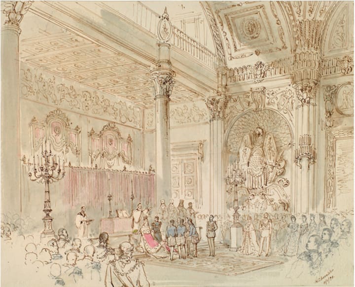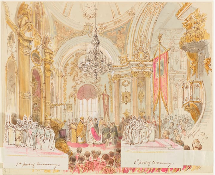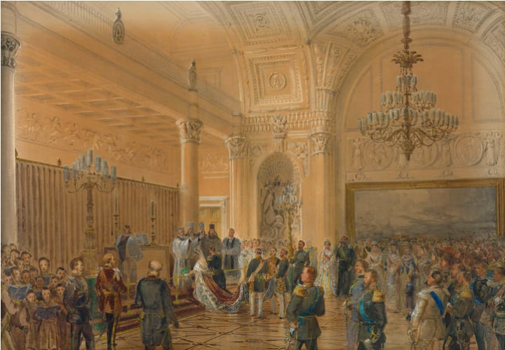 The Roll Call provides a transition in the exhibition between the powerful members of the court in the Emerald Room and the more personal events surrounding the connections between England and Russia. There were two marriages in the history of the Russian and British Empires that became defining between both countries. The first was the marriage Maria Alexandrovna and Prince Alfred in 1874. A portrait of Maria Alexandrovna joined a group of paintings of Victoria's daughters in law in the Oak Room of Windsor. It was a gift of Marie's father, Alexander II, and shows the Queen's symbolic welcoming of a new daughter in law in to her growing family.