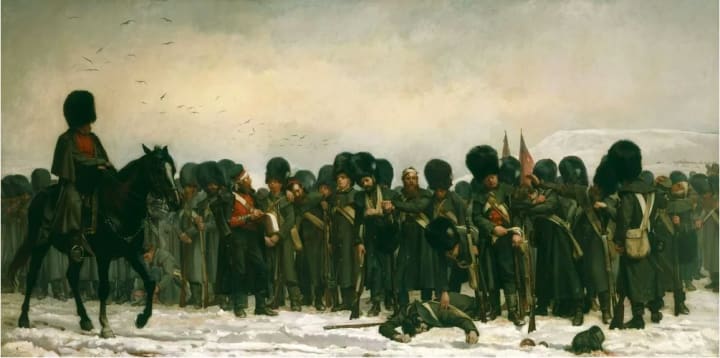 The composition has an unconventional, horizontal perspective, with a mounted soldier on a horse at the far right of the canvas. It is an extremely unique depiction of war as a painting as oppose to the more conventional forms of representation through prints and photography. Butler submitted it for display in 1874 to the Royal Academy. It was bought by Queen Victoria and used during Alexander II's visit to England in this same year as a statement of the her concern for the challenges that had risen in the past due to alliances between their countries. His daughter, Maria Alexandrovna, and Queen Victoria's son, Alfred, were to be married that same year.
