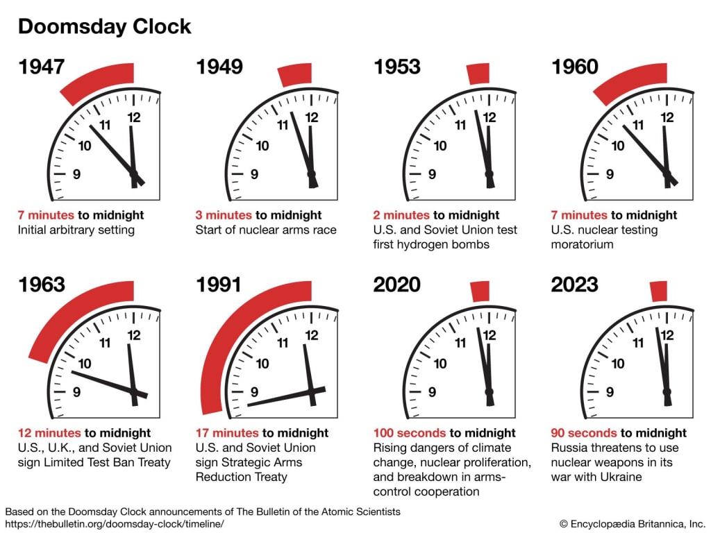 The clock’s hands are adjusted annually based on the assessment of leading scientists and experts. The closer the clock is to midnight the greater the perceived risk of global catastrophe. In 2023 the clock was set at 90 seconds to midnight the closest it has ever been to the symbolic point of no return.
