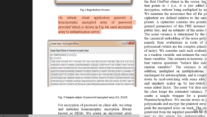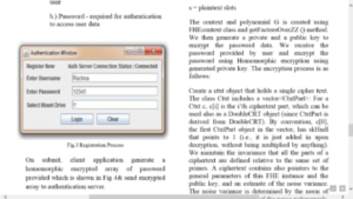 For encryption of password on client side, we setup and initialize homomorphic encryption library known as HElib. We create an encrypted array object ea with a given context and polynomial G. Context is generated with the help of the following parameters: p = Characteristics of plaintext space L = number of levels c = number of columns in key switching matrices k = security parameter d = embedding degree (d ==0 or d==1 => no constraint) s = plaintext slots The context and polynomial G is created using FHEcontext class and getFactorsOverZZ () method. We then generate a private and a public key to encrypt the password data. We receive the password provided by user and encrypt the password using Homomorphic encryption using generated private key. The encryption process is as follows: Create a ctxt object that holds a single cipher text. The class Ctxt includes a vector<CtxtPart>: For a Ctxt c, c[i] is the i’th ciphertext part, which can be used also as a DoubleCRT object (since CtxtPart is derived from DoubleCRT). By convention, c, the first CtxtPart object in the vector, has skHndl that points to 1 (i.e., it is just added in upon decryption, without being multiplied by anything). We maintain the invariance that all the parts of a ciphertext are defined relative to the same set of primes. A ciphertext contains also pointers to the general parameters of this FHE instance and the public key, and an estimate of the noise variance. The noise variance is determined by the norm of the canonical embedding of the noise polynomials, namely their evaluations in roots of the ring polynomial (which are the complex primitive roots of unity). We consider each such evaluation point as a random variable, and estimate the variances of these variables. This estimate is heuristic, assuming that various quantities "behave like independent random variables". The variance is added on addition, multiplied on multiplications, remains unchanged for automorphism, and is roughly scaled down by mod-switching with some added factor, and similarly scaled up by key-switching with some added factor. The noise Var data member of the class keeps the estimated variance. Then we create a simple wrapper for a pointer to a PlaintextArrayBase. We encode arrays in plaintext polynomials and encrypt the plaintext array and we push the encrypted array on stack. The cipher text generated from the supplied password by the user is sent to the server for authentication. Server maintains a copy of ciphertext for equality testing of encrypted password.