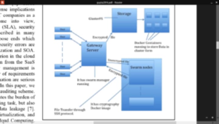 The Above figure is an overall image of how a cryptographic process will carry out using a Docker and Gluster File System. The protocols Docker & GlusterFS are briefed in the coming section but here the main deal is, how a USER sends his or her data to the Gateway server and swarm manager which accepts its data, send it to a random node from its cluster of nodes for the process of encryption, and post encryption in same node, it comes back to the main server again which then is forwarded to the Storage server to replicate and strip it over multiple running Docker containers. Initially, whenever a User sends it data, a Gateway server, which is running a DOCKER SWARM, accepts this unencrypted file from the User. DOCKER SWARM is like a manager of the Docker containers running the Dockers image of encryption and decryption and it is controlled through the Gateway server containing swarm manager. The Next Process is all about encrypting the data. So, the swarm manager sends the unencrypted data from user to the node running Docker cryptography container, which can use AES or RSA or any standard encryption algorithm, encrypts the data and, after encryption, the data is send back to the Gateway server. This incoming and outgoing process or transaction of file is carried out through SSH protocol. Now comes the step where the user data is encrypted but still it needs to be stores such that it is highly available. Now, the encrypted data is sent back at gateway manager which sends the data to another node containing storage manager GlusterFS which is connected to a whole new node containing multiple Docker containers running and the encrypted data will now be distributed and stored on this container cluster using Glusterfs. This way, the file with encrypted data will be stored on multiple docker containers forming a cluster of Storage in order to save data in chunks. Even if the node is compromised, the attacker will not get the data as the containers need to be compromised as well and more over there are number of containers and each container doesn't have the complete data. This Process of encryption and storage of data is extremely resource efficient as Dockers are used to make the whole run in minimal resource. The Docker runs its instance in a single process of the operating system that means the whole encryption process or the storage node runs on a single CPU process, occupying minimal resources. This Process of encryption and storage of data is extremely resource efficient as Dockers are used to make the whole run in minimal resource. The Docker runs its instance in a single process of the operating system that means the whole encryption process or the storage node runs on a single CPU process, occupying minimal resources. Now according to our model, the load on the server for encryption can be properly balanced by increasing the no of nodes of the docker cluster having cryptographic image. And same goes for the storage. Proposed protocol : This protocol compromises of several other protocols. The users interact through the Gateway server through HTTPS protocol to upload their data. The docker container clustering protocol Docker Swarm has its manager setup on this gateway server. So the file uploaded by user is immediately forwarded to a node of the swarm cluster where swarm manager sends a signal to launch a container and the data will be mounted on it and the container will use openssl protocol to encrypt the data via AES, RSA or any other standard encryption algorithm. As soon as the encryption is done, the container terminates and the encrypted data is pulled back to the gateway server and then forwarded to the storage server. The file is transferred from gateway server to other nodes and servers via SSH protocol. The storage server has a cluster of docker nodes running which take disk space from the main system. Glusterfs protocol is used to strip the data into multiple chunks and also replicate it to a backup node if any and store it on the container cluster. In case the user demands to download his data he puts a download request through HTTPS on gateway server and then the gateway server retrieves the file from the storage server and forwards it to its node for decryption, which involves same process as encryption. The decrypted data is pulled back to the gateway server and then available for the user to download.