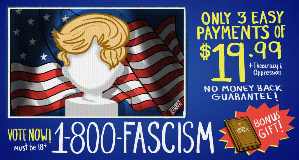 Pay attention, folks. Sinclair Lewis is often credited as telling us a long time ago that when fascism comes to America it will come wrapped in a flag and holding a cross. Wanna buy that bible that Don Poorelone is hawking, do ya?
