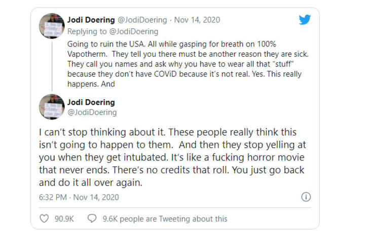 We all know Trump is undermining democracy itself with his unfounded claims of fraud, but the biggest threat we all face is Covid-19. Just this week, an emergency room nurse named Jodi Doering was telling how in South Dakota, people coming into the ER literally dying of Covid-19 were still in denial with their last breath. They even insisted in a few cases that they must be dying of lung cancer instead of Covid-19 and lashed out at nurses.