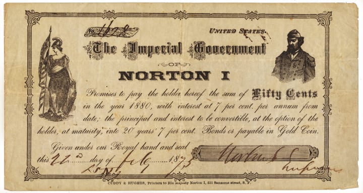 He even issued his own currency, fifty cent bonds produced free of charge by a local printery, which he would exchange for legal currency to support his modest needs. Many local businesses soon began accepting this script as legitimate currency. When short of funds, Norton would collect from his subjects their royal taxes, always a small amount to cover only his immediate needs, for which he would instantly provide a handwritten receipt.