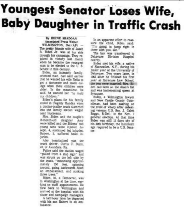 On August 27th, 1966, when Biden was 23 years old, Biden married Neilia Hunter in Skaneateles, New York. They would have three children together, Joseph R "Beau" Biden III (1969-2015), Robert Hunter Biden (b. 1970), and Naomi (1970-1972).