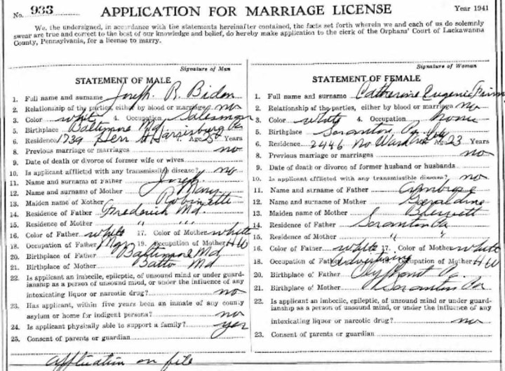 Joseph Robinette Biden was born November 13th, 1915 in Baltimore, Maryland to Joseph Harry Biden and Mary Elizabeth Robinette. Catherine Eugenia Finnegan was born July 7th, 1917 in Scranton, Pennsylvania to Ambrose Joseph Finnegan and Geraldine Blewett. On October 16th, 1940 Joseph signed up for the draft as the United States entered into World War Two. On his draft card, Joseph is listed as working for American Oil in York, Pennsylvania. He is also listed as being 6 feet tall, 153 pounds, and having hazel eyes, black hair, and a light complexion.