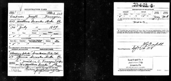Ambrose Joseph Finnegan was born July 11th, 1883 in Olyphant, Pennsylvania to James Finnegan and Catherine Roche. Geraldine Blewett was born January 1st, 1886 in Scranton, Pennsylvania to Edward Blewett and a mother who's name is unknown. Between 1900 and 1910, Ambrose and Geraldine married. By 1910, the two were living at the Finnegan residence in Pennsylvania where Ambrose worked as a civil engineer. By September of 1918, Ambrose and Geraldine moved to a new home in Scranton, Pennsylvania on Woodlawn street. This was listed on Ambrose's draft card for World War One. On this card, he is also listed as being tall, medium build, and having gray eyes and dark hair. Ambrose was also working as an advertising solicitor for a local newspaper.