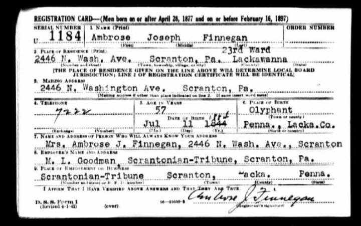 By 1930, the Finnegan family moved to a house on Monsey Avenue in Scranton, Pennsylvania. Ambrose was now working as an advertising manager in the newspaper industry while Geraldine was a housewife staying home with their remaining children that lived with them. In April of 1942, Ambrose would once again register for the draft as the United States entered into World War Two. During this time, Ambrose was still working in advertising but this time is listed as working for the Scrantonian-Tribune.