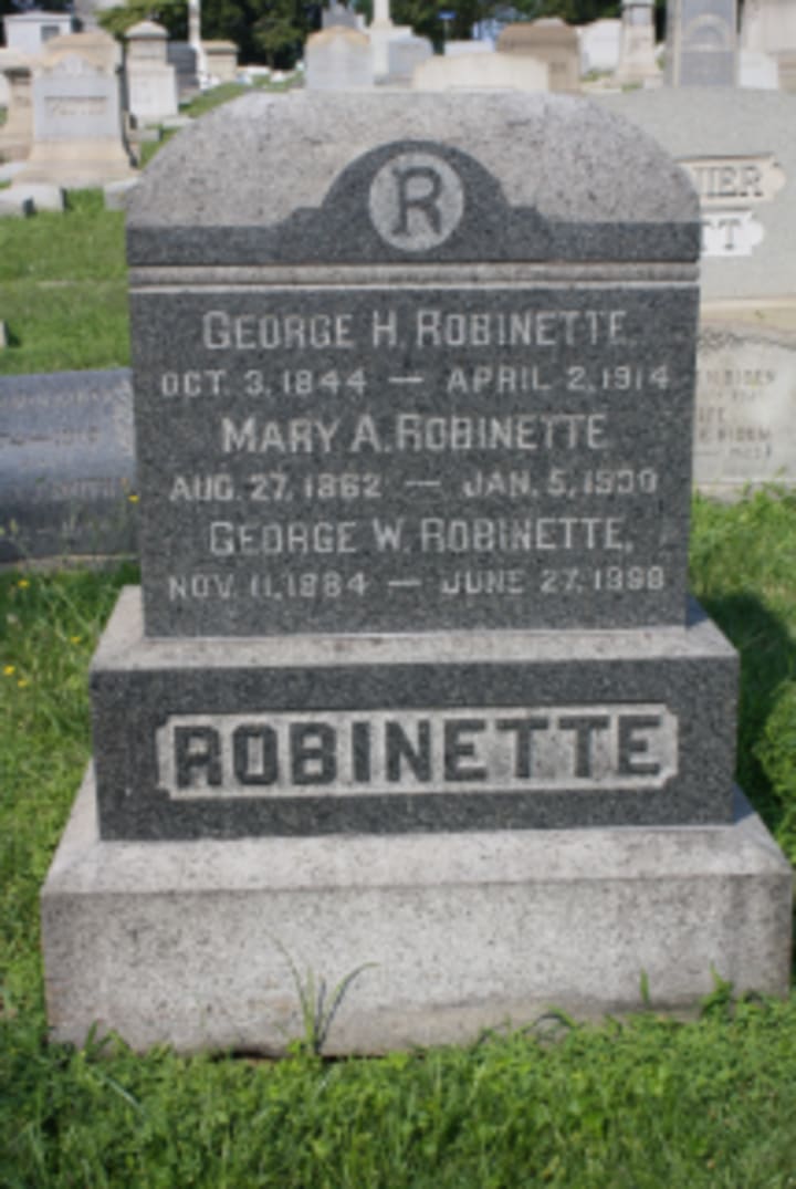 George Hamilton Robinette was born October 3rd, 1844 in Maryland to Moses Robinette and his mother whose name is unknown. Mary Ann was born August 27th, 1862 in Ohio to parents whose names are unknown. In 1882, George and Mary Ann married, when George was 38 and Mary Ann was 20 years old. By 1900, the Robinette family moved to 21 East Hill Street in Baltimore. In the Census that year, George is listed as working as a locomotive engineer and they had their three children living with them. By 1910, the Robinettes were still living in their house on East Hill Street but by this time, George was now working as a railroad inspector. Unfortunately, George died just four years later on April 2nd, 1914 at age 69. Mary Ann died sixteen years later on January 2nd, 1930 at age 67. They are now buried in Loudon Park Cemetery in Baltimore,