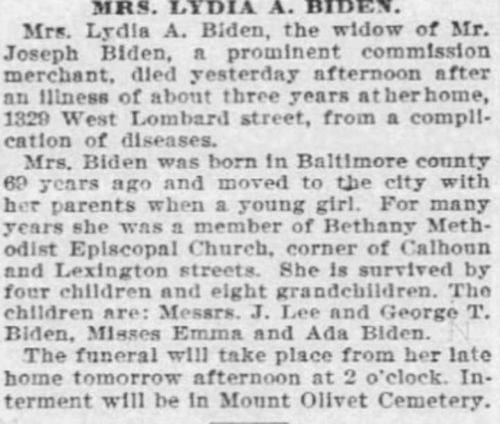 By 1870, the Biden family was still living in Baltimore and Joseph was still working as a carpenter. By this point, they had four more children together bringing the total to eight. By 1880, the Biden family moved to 639 West Lombard Street in Baltimore. Joseph was still working but was now working as a packer. Joseph would eventually become a prominent commission merchant in Baltimore in his later years until his death on June 2nd, 1895 at age 68. Lydia died September 7th, 1902 after an illness at age 67.