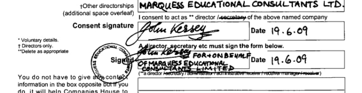 John Kersey signs as Director of Marquess Education on Companies House Document