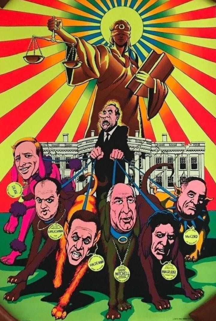 Remember the black light phase? The blue light that made everything glow and mesmerized us back in the 60’s and 70’s. I had a poster with Nixon holding leashes behind a pack of dogs all hooked up. The canine faces were replaced by humans, politicians mixed up in the Watergate scandal.