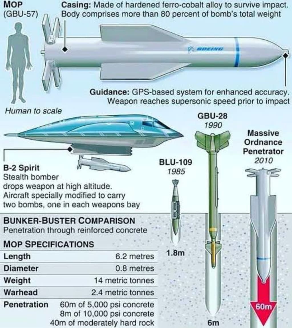 Weighing in at 30,000 pounds (approximately 13,600 kilograms), it stands as the heaviest conventional bomb in the U.S. arsenal. Despite its massive size, its purpose is precise: to strike deeply buried and hardened targets — like Iran’s Fordow nuclear facility, which is nestled deep within mountainous terrain and reinforced concrete.