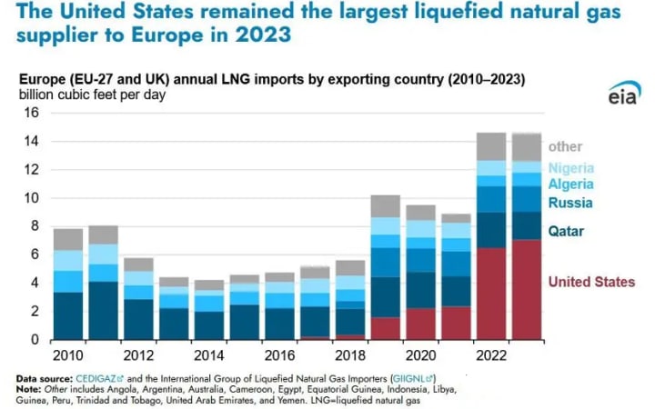 Norway is now Europe’s largest natural gas supplier, but the U.S. has significantly increased its role as well. Liquefied natural gas (LNG) imports from the U.S. have surged, benefiting from higher prices and rising European demand.