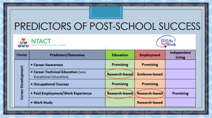 The presentation by the “District Office of Transition Services” went off track on the third slide in the presentation when it was mentioned that the work of this department aligned with the “College and Career Readiness” portion of the LAUSD’s “Ready for the World” Strategic Plan, most specifically “Academic Excellence.” More concerning was the fact that they considered Career Awareness, Career Technical Education, Occupational Courses, Paid Employment/Work Experience, and Work Study as predictors of post-school success. None of these applied to what my daughter needed from her LAUSD experience. Do these bureaucrats even think about children like her when they build these programs?