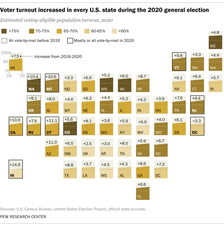 Source: Pew Research Center, Turnout Soared in 2020 as Nearly Two-thirds of Eligible U.S. Voters Cast Ballots for President, January 2021 (Used with permission).