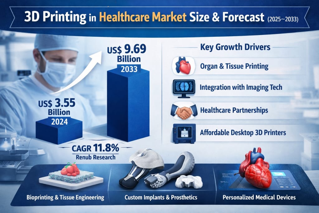 The 3D Printing in Healthcare Market is entering a powerful growth phase, driven by rapid technological progress and rising demand for personalized medical solutions. According to Renub Research, the market was valued at US$ 3.55 billion in 2024 and is expected to reach US$ 9.69 billion by 2033, growing at a CAGR of 11.8% from 2025 to 2033. This impressive expansion reflects how additive manufacturing is steadily moving from experimental labs into mainstream hospitals, clinics, and research centers worldwide.