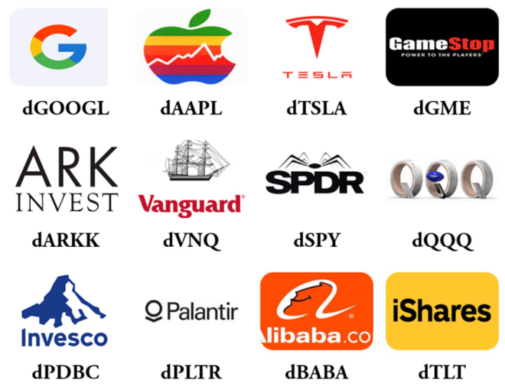 - Decentralized assets: Decentralized assets represent a revolutionary way of investing, combining the best of both worlds of the high yields of liquidity mining of cryptocurrencies with the familiarity of investing in a conventional stock market. These decentralized assets are known as dTokens, which exist on the DeFiChain network and are essentially a digital reflection of a valuable asset, for instance major stocks, ETFs and precious metals, whose price is tracked by the corresponding dToken.