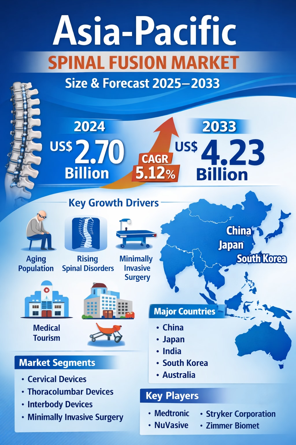 The Asia-Pacific spinal fusion market is entering a decisive decade of expansion, driven by demographic change, technological progress, and rising demand for advanced orthopedic care. The market is expected to reach US$ 4.23 billion by 2033, up from US$ 2.70 billion in 2024, growing at a compound annual growth rate (CAGR) of 5.12% from 2025 to 2033.