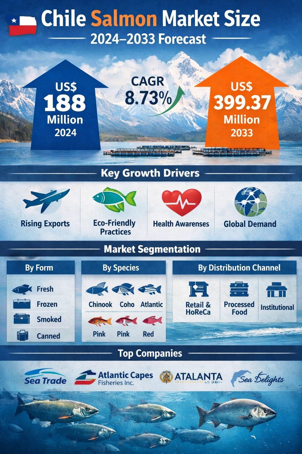 According to Renub Research’s latest industry outlook, the Chile Salmon Market is projected to grow from US$ 188 million in 2024 to US$ 399.37 million by 2033, expanding at a compound annual growth rate (CAGR) of 8.73% from 2025 to 2033. This robust growth trajectory reflects not only rising global demand for seafood but also Chile’s strengthening position as one of the world’s most important salmon-producing nations.