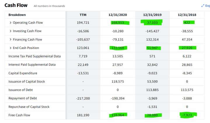 In 2018 they were on a negative free cash flow, and then boom. From 2019 to 2020 they had an increase of 140% of free cash flow.