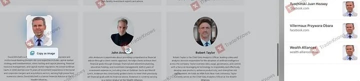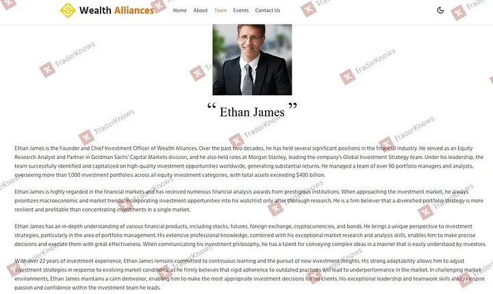 They then roll out their fabricated history. They position themselves as the founding partners of "Wealth Alliances," leading a team of supposed luminaries from world-renowned financial corporations. The website is constructed specifically to neutralize any shred of doubt.