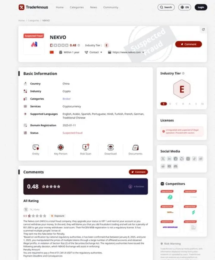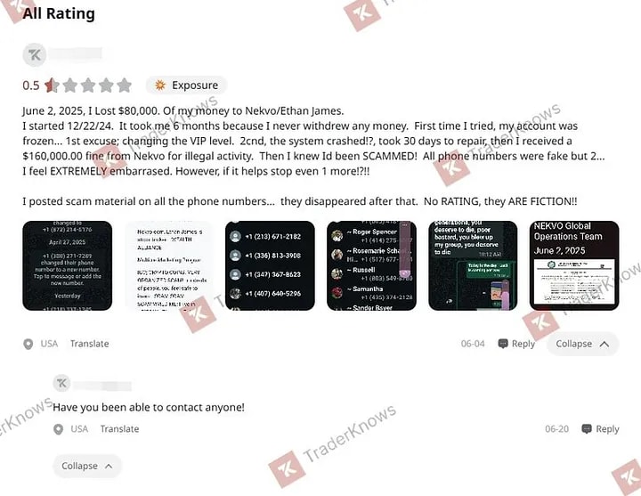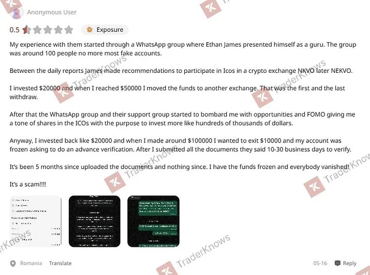 A review of user feedback for NEKVO on TraderKnows shows a clear, consistent script for denying withdrawals.
